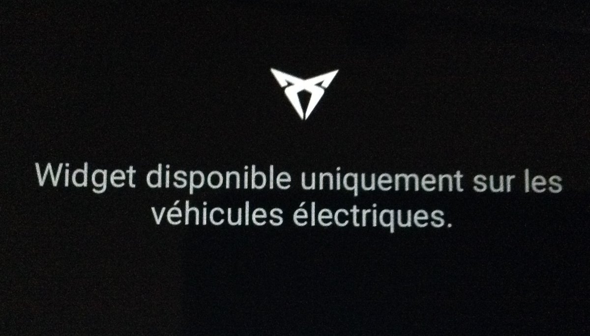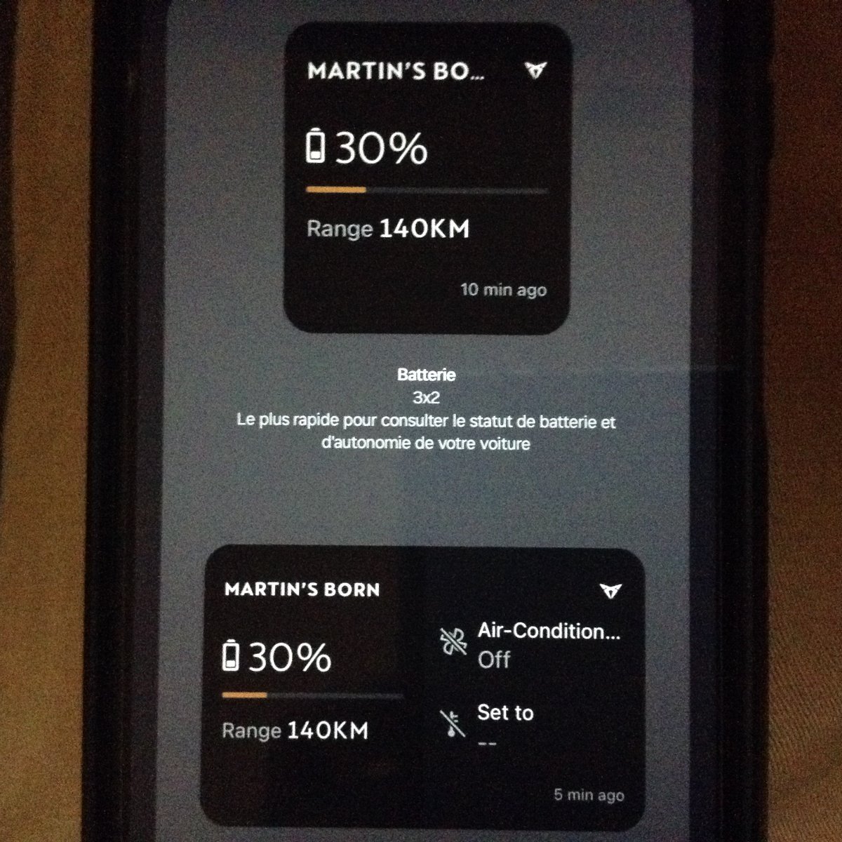 Salut, Pour ceux qui avaient un problème d'affichage avec les widgets, une nouvelle mise à jour d'aujourd'hui semble avoir corrigé le soucis pour born et Tavascan. J'avais cet affichage depuis quelques jours. L'affichage est revenu à la normale avec toujours le choix de deux présentations (batterie et autonomie ou batterie-autonomie et état de la climatisation).
