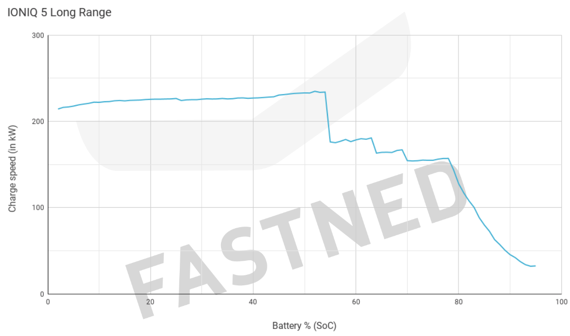 Il faut regarder la courbe de charge de la batterie de la Ioniq5 mais le pic de puissance a 240kW se situe entre 35% et 55% de SOC -
