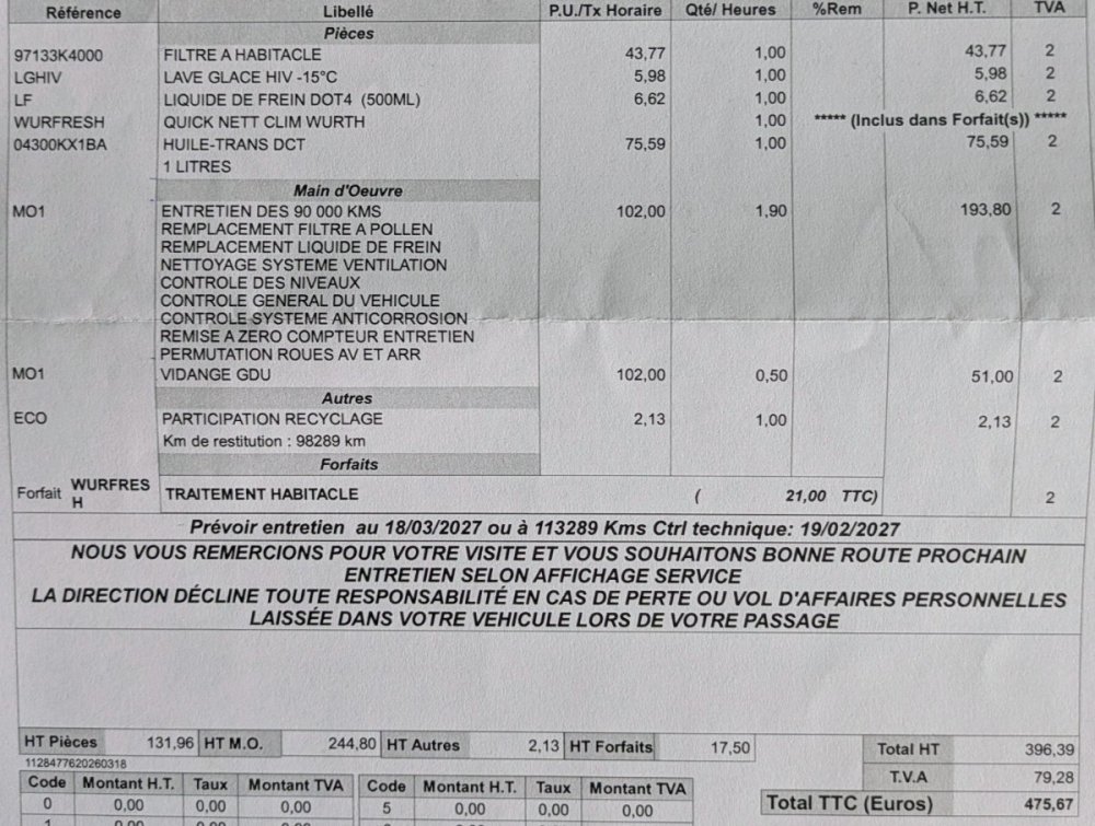 Bonjour, J'ai fait réaliser l'entretien 98.000 km 5ans. J'ai demandé en plus une vidange du réducteur et permutation pneus AV/AR (qui m'a été offerte à ma demande) Ils n'ont pas gardé d'échantillon d'huile réducteur malgré ma demande. D'après leurs dires elle était en bon état ... Pas d'autres choix que de les croire. La facture pique ! Sois disant ça coûte moins cher qu'une thermique, bien sûr oui. Une fois la garantie batterie passée je ferai autrement, voir même juste rien du tout.