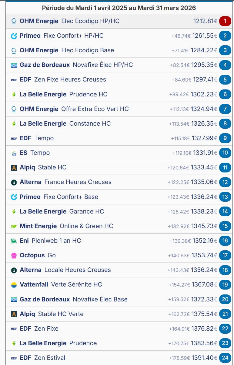 Capfile m'aide beaucoup à savoir si je gagne vraiment avec ma consommation. L'offre EDF Zen est bien loin (à l'année) et même Tempo s'est bien éloignée. Je ne suis pas mécontent de l'avoir quittée. Bien sûr, l'offre EDF Zen est intéressante si l'on se dit qu'on ne la prend que pour l'été, et qu'on espère ensuite trouver une offre proche du tarif Ecodigo. C'est quand même un sacré pari. -