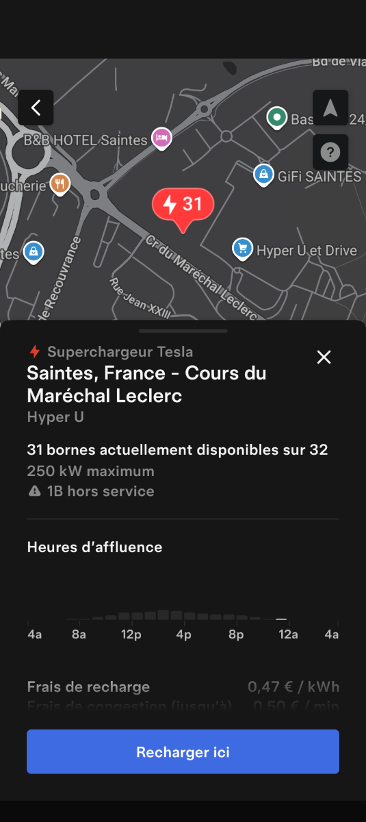 Agrandissement terminé d'une station Tesla à Saintes (Hyper U) Ajout de 8x 250kW CCS Soit 32x 250kW CCS Prix sans abonnement/non Tesla sur la capture Comme d'habitude, retrouvez le lien vers ma carte : https://tinyurl.com/StationsVE Toute l'actu des stations de recharge sur le groupe FB : https://tinyurl.com/GroupeFacebookVE
