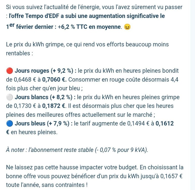 Ya un sujet dédié tempo dans la section recharge à domicile. S'il fallait le résumer à la très grosse louche : ça dépend de vos usage. Perso je suis passé d'une mensualité de 86€ en base à 62€ en tempo, quand bien même je ne fais tourner ni lave linge ni sèche linge en HC. Comme j'ai pu le dire, 5 des 6 tarifs sont inférieurs au tarif base, et les 3 tarifs HC sont inférieurs au tarif HC du contrat HP/HC. Néanmoins, le message envoyé à ceux qui participent à soulager le réseau les jours de tension est vraiment pas bon... -