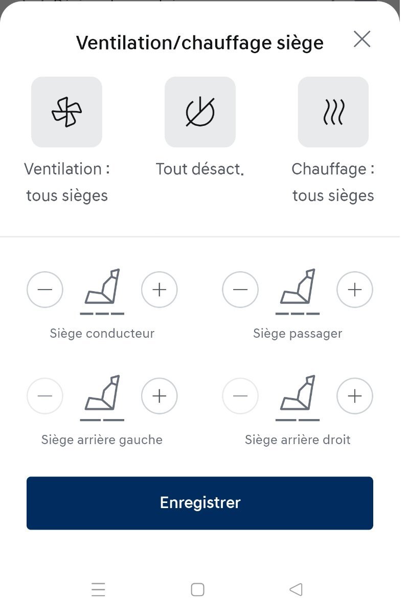 Dans l'appli my Hyundaï ---> parametres de climatisation ----> sieges Cliquer sur "desactivée" ..................et vous pouvez commander tous les sieges chauffants. -