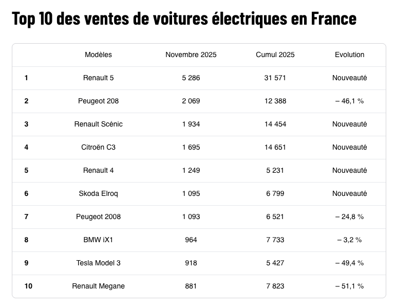 La Renault 5 est encore la voiture électrique la plus vendue en novembre en France, de très loin. 2ème électrique en Europe sur octobre (3ème sur toute l'année). et (tableau couleur) 7ème en France sur l'année toutes motorisations confondues (en comptant les versions alpine), et même 6ème en comptant les VUL Et tout ça avec la concurrence interne de la R4 et de la twingo qui approche. Réjouissant non? Toutes motorisations France sur l'année 2025 : Electriques france en Novembre : -