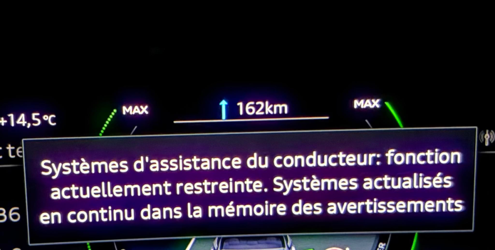 Bonjour à tous, Nous sommes plusieurs à rencontrer un bug avec nos A6, principalement pour des vitesses > 110km/h, avec un bip sonore et un affichage d'erreur comme ci-dessous, tous les 15 / 20km environ... Question : êtes vous concernés avec votre Q6 ?