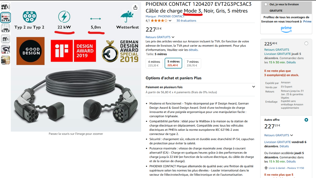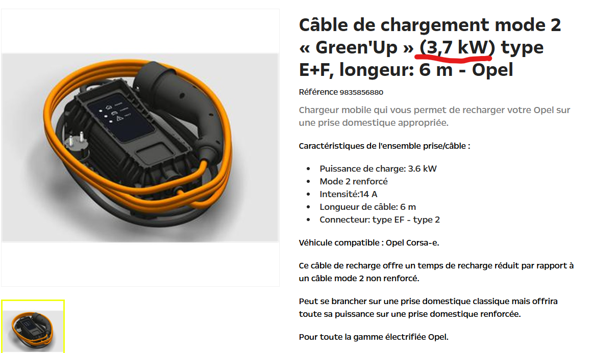Peut être un bon plan pour toi 😀 J'ai acheté un cable mode 3 , il est dans le coffre de la voiture ,jamais servi et finalement je crois que je ne m'en servirais jamais .( puisque pour moi c'est domicile ou borne charge rapide ,disponible partout ) C'est un 32A ,et pourquoi 32 A ? : le cable 22 kW permet seul de recharger à 7.4 kW sur une borne monophasée et 11kW sur borne tri. ( en 2022 35 % point de charge en France = courant monophasé avec puissance < ou = à 7.4kW ) Sauf erreur de ma part bornes communales ,c'est plutôt monophasé ! , les plus récentes c'est plutôt tri . C'est un cable de très bonne qualité cable 5G6 +1x0.5 ( prix à débattre .....) Et en plus j'ai aussi ,d'un précèdent véhicule ,un cable dispo en mode 2 ,lui aussi excellente qualité et en bon état . Et c'est bien un 3.7 kW ( sur Green up 16A ou 8 A sur prise normale ) La preuve avec capture : Donc si intéressé par du matériel de " collègue" Inster ......