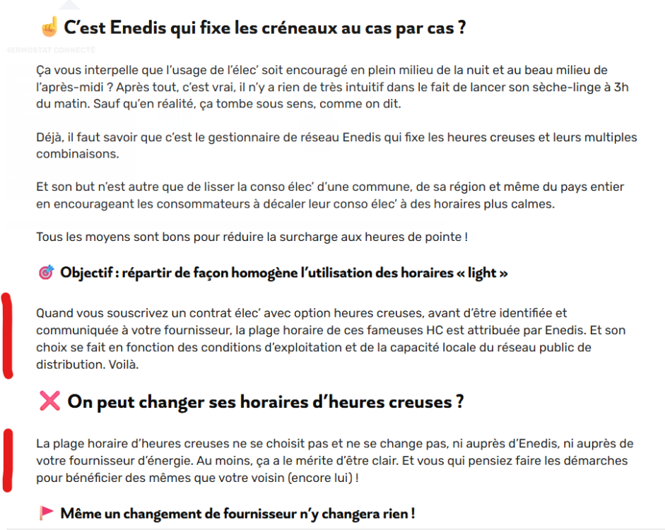 Il faut plutôt se préparer à ce qu'une fois la transition bien engagée, l'électricité (ou qque chose sur les VE comme une vignette ?) soit taxée pour financer l'entretien des routes, qu'actuellement nous empruntons "gratuitement" en laissant les utilisateurs de véhicules thermiques financer via les taxes sur les carburants... Je songe sérieusement à passer vers l'offre Octopus-Que choisir en remplacement de Tempo, mais connaître les heures creuses est crucial pour savoir si "gérer" les 22 jours rouges est plus ou moins embêtant que gérer des heures creuses mal placées. Or je n'arrive à trouver l'info concernant les plages horaires HP/HC de mon adresse NULLE PART et ça me gave ^^ -