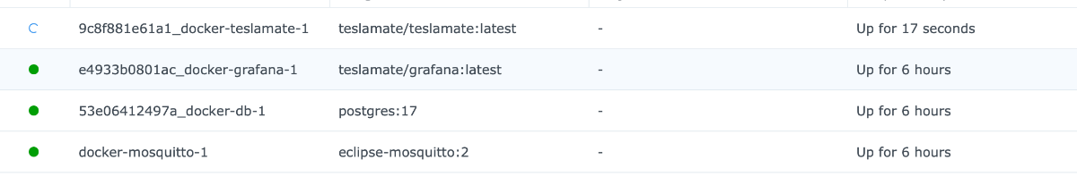 Merci. Cette étape me donne cela: root@Cervin:/volume1/@docker# docker-compose exec -T database psql -U teslamate << . > ALTER DATABASE teslamate REFRESH COLLATION VERSION > . service "database" is not running root@Cervin:/volume1/@docker# par contre çaa renommé mes docker on dirait: et le 1er redémarre en continue