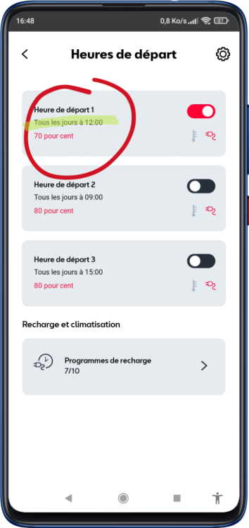 3. @Athas : tu n'as pas répondu à mes questions. Utilises-tu les horaires préférés ? Pour information, ma recharge est bien programmée tous les jours à la même heure. Je vais lancer le chauffage à distance, pour passer sous 70% de SoC, et vérifier si la charge se relance ou non.