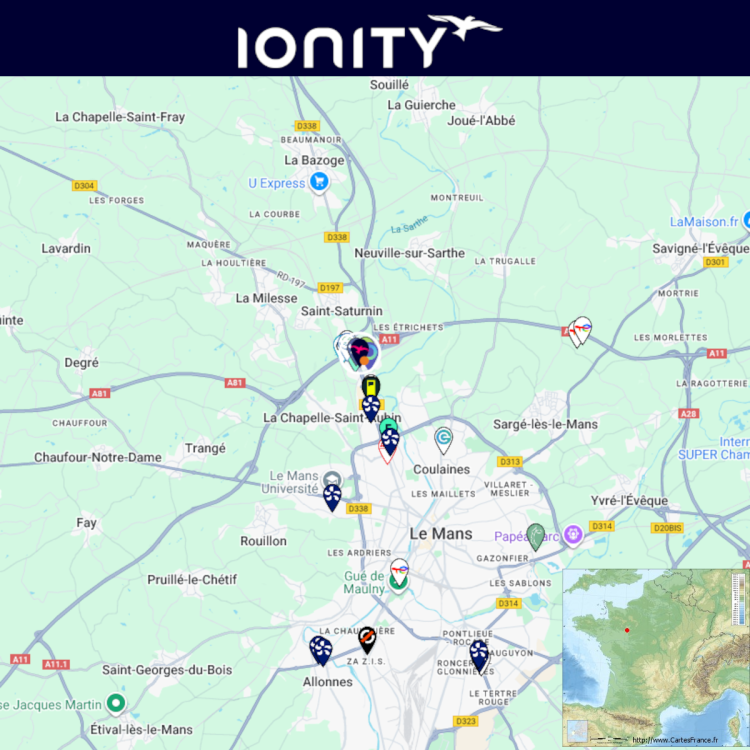 Construction d'une station Ionity à Saint-Saturnin. Le long de l'A11, sortie 7. Comme d'habitude, retrouvez le lien vers ma carte : https://tinyurl.com/StationsVE Toute l'actu des stations de recharge sur le groupe FB : https://tinyurl.com/GroupeFacebookVE - Aujourd’hui