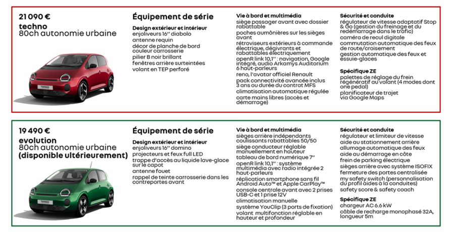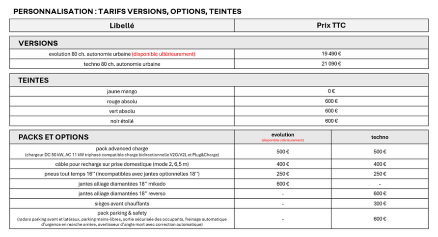 Mêmes tarifs qu'en Italie, le configurateur français est en ligne. - Version Techno commandable dès maintenant ou le 8 janvier sans R-pass (21.090€ + 500 pack DC/V2L avec 3.620€ de bonus pour tous soit 17.970€ nets) - Version de base commandable au printemps (1.600€ de moins soit 16.370€) https://www.renault.fr/vehicules-electriques/twingo-e-tech-electrique/pre-configurateur.html -