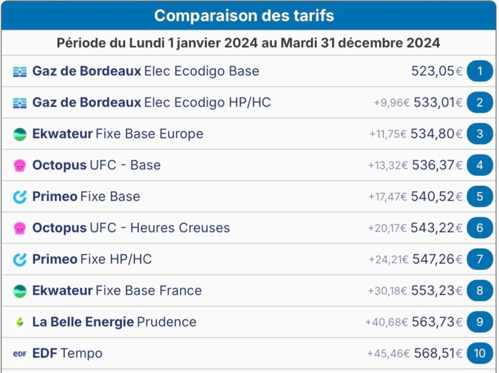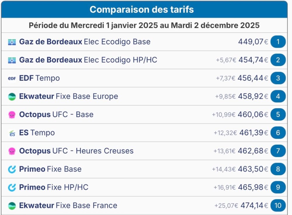 Voilà c'est fait. Donc mon tempo n'est pas mal du tout calculé sur l'année 2025. Par contre sur 2024 c'est moins bien, ceci étant sans doute dû à mon passage de l'option base EDF à Tempo en mai 2024. -