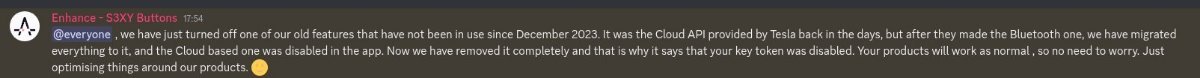 Pour ceux qui se posent la question d'avoir eu en fin de journée un message de l'app Tesla indiquant que "enhauto.com n'est plus défini en tant que clé pour votre véhicule", c'est normal, pas d'inquiétude. C'est juste une suppression d'une API plus utilisée. Les produits S3XY fonctionnent normalement. Enhance pensait que puisque l'API était inutilisée depuis plus de 2 ans, personne n'était connecté avec, et donc, ils n'avaient pas envoyé de mail explicatif avant la suppression de cet ancien API.