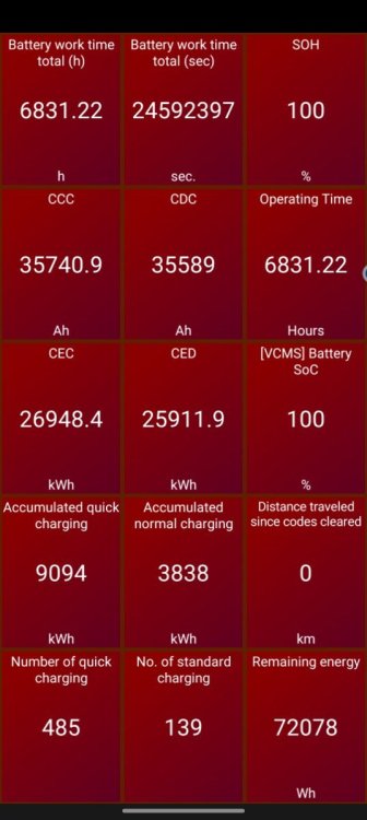 @as1chrone Je viens observer ma première baisse de kWh disponible à 100%. Je suis passé de 72510 Wh à 72078 Wh. Observation faite le 27 septembre au matin après une charge à 100%. Le kilométrage de la voiture est de 173515 au moment de la lecture et le SOH est toujours de 100%.