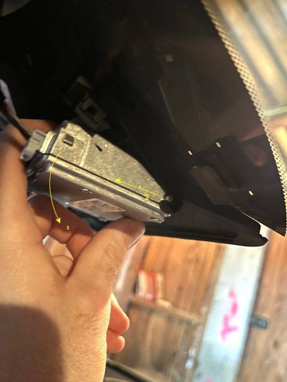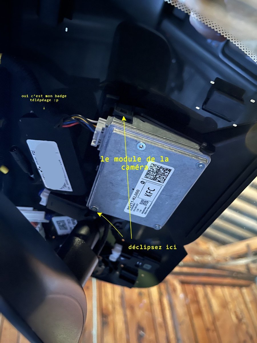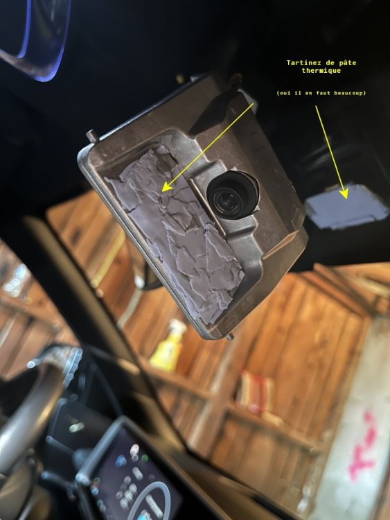 C’est un problème récurrent sur cette voiture : parfois la caméra derrière le miroir central accumule de la buée et affiche alors des alertes (5 alertes, sur la désactivation du maintient de ligne, notamment). La buée s’accumule car l’air humide s’élève naturellement (moins dense), et cet endroit est mal ventilé et donc mal chauffé aussi. La zone devant la caméra est enfermée et impossible d’accès. On ne peut pas l’essuyer ni le sécher. Depuis que j’ai fait l’astuce qui va suivre, en septembre 2025, j’ai dû avoir le problème 3 ou 4 fois seulement. Notons que : ‑ désormais la voiture a un garage ‑ j’utilise le préchauffage cabine tous les matins - j’utilise la FitCam X (qui chauffe et donc réchauffe un peu la zone embuée). Je l’ai depuis le début, et il ne suffisait pas encore totalement au début. Mon astuce est d’utiliser la (forte) chaleur du module de la caméra pour réchauffer la zone embuée au dessus. J’ai aussi entaillée le plastique du couvercle qui cache ces modules, afin de libérer un espace pour que l’air de la clim puisse y circuler un peu mieux. Bref, voici la méthode. 1. Commencez par baisser le rétro central. 2. Retirez le cache. La petite partie centrale (1) vers nous se retire facilement avec le doigt. Pour la partie principale (2), poussez le vers le bas (vers le bas du pare-brise) et en tapotant un petit peu, il se déclipsera. Ne forcez pas si ça vient pas. La partie à retirer, c’est la module gris : Il est tenu par deux clips sur les côtés, et ensuite par une goupille dans une encoche en U. ATTENTION : allez-y doucement avec les clips, car si vous les cassez, vous ne pourrez pas le remettre en place. On peut utiliser une carte (style carte bancaire) pour soulever légèrement les clips qui maintiennent le module. Une fois déclipsé, pivotez vers le bas (1), puis tirez vers vous (2) : Ensuite, le module est défait. Tartinez tout ça de pâte thermique. Il y a bien 1,5 mm à combler pour que sa chaleur soit transmise au plastique, et ensuite à l’espace vide qui s’embue au dessus. Ne touchez pas à l’objectif de la caméra avec vos doigts sales. Puis remettez tout ça en place. En sus, mais là c’est un mod destructif, vous pouvez raboter un peu le cache principal sur la partie basse, sous la caméra, pour laisser un jour un peu plus important. Vous pouvez aussi y mettre une petite cale, mais pas trop grand car vous ne voulez pas casser les pièces qui maintiennent le cache sur la vitre.