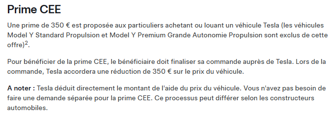 Ne pas confondre la prime "Coup de pouce" qui remplace le bonus écologique, et qui doit répondre à plusieurs critères (dont l'Eco score), et la prime dite CEE (liée aux Certificats d'Economie d'Energie) pour les véhicules électriques qui ne remplissent pas les critères d'Eco score pour le prime "Coup de pouce". https://www.economie.gouv.fr/particuliers/voyager-et-se-deplacer/achat-dun-vehicule-electrique-pouvez-vous-beneficier-de-la et https://www.largus.fr/actualite-automobile/bareme-des-prix-cee-par-constructeur-la-nouvelle-aide-sans-conditions-et-compatible-avec-le-bonus-30040396.html https://www.tesla.com/fr_fr/support/incentives#:~:text=de l'Énergie.-,Prime CEE,sa commande auprès de Tesla. Pour le coup, ce n'est pas Tesla qui est à l'origine d'une confusion.