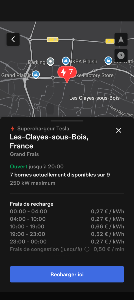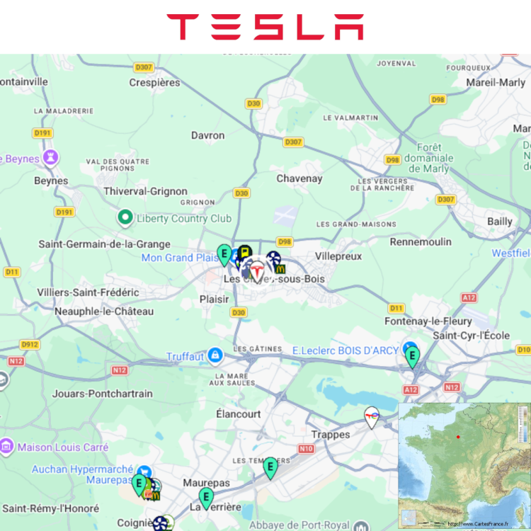 Ouverture d'une station Tesla à Les Clayes-sous-Bois (Grand Frais). 9x 250kW CCS Prix sans abonnement/non Tesla sur la capture Comme d'habitude, retrouvez le lien vers ma carte : https://tinyurl.com/StationsVE Toute l'actu des stations de recharge sur le groupe FB : https://tinyurl.com/GroupeFacebookVE