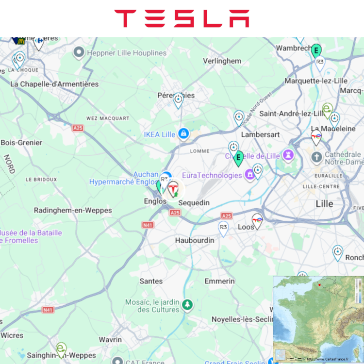 Agrandissement terminé d'une station Tesla à Englos (Auchan). Ajout de 12x 250kW CCS Soit 28x 250kW CCS Prix sans abonnement/non Tesla sur la capture Comme d'habitude, retrouvez le lien vers ma carte : https://tinyurl.com/StationsVE Toute l'actu des stations de recharge sur le groupe FB : https://tinyurl.com/GroupeFacebookVE