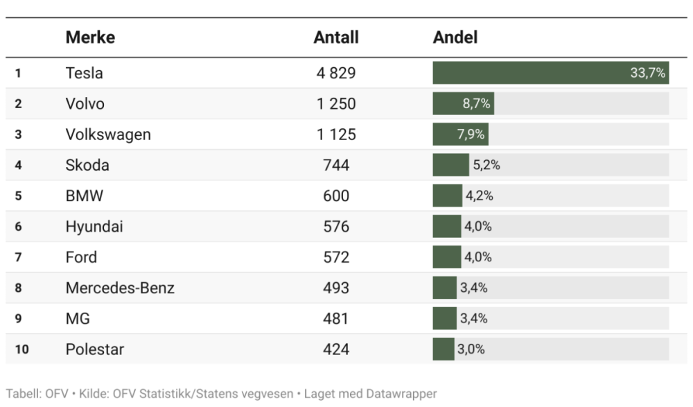 En Norvège derrière Tesla c’est Volvo qui vol la vedette à VW heureusement Skoda avec son excellent Elroq sublime les résultat du groupe. il ne reste plus beaucoup de place quand une voiture a un moteur thermique en Norvège aujourd’hui. Il se partage des pouillèmes de la peau de chagrin. « Aperçu de la répartition exacte des motorisations : les véhicules diesel représentent encore 105 immatriculations et une part de marché de 0,7 %. Les hybrides rechargeables essence ne jouent quasiment aucun rôle en Norvège (58 unités, 0,4 % de part de marché), et les ventes d'hybrides essence sont encore plus faibles (30 / 0,2 %), d'hybrides rechargeables diesel (27 / 0,2 %) et de voitures essence pure (25 / 0,2 %). » cela arrivera aussi dans tous les autres pays européens plus vite que certains ne le pense. -