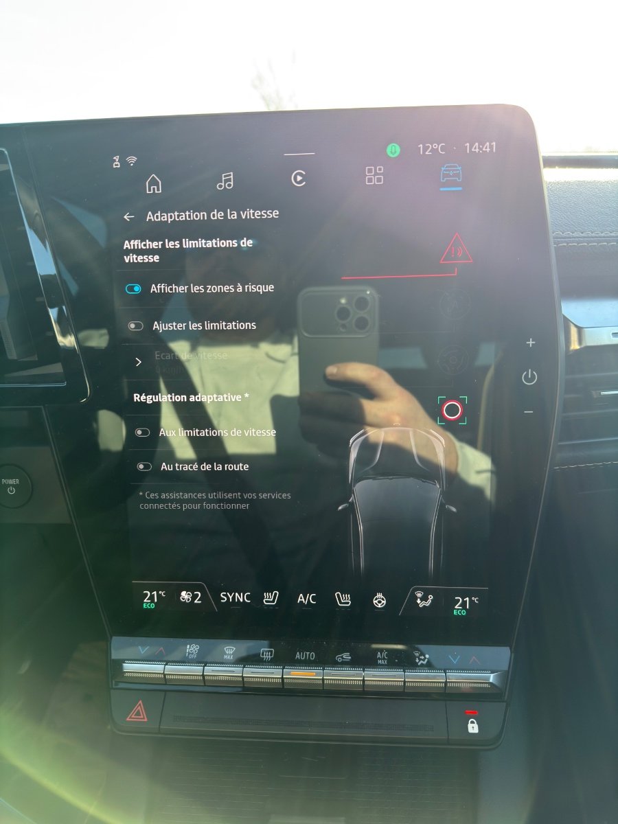 9. Petite nouveauté bienvenu sur laquelle je suis tomber en réactivant les ADAS.. Par contre, les premiers démarrage il se passe des chose en arrière plan, j’ai fais 20km, CarPlay wifi a coupé 5 fois (alors que jamais en 3 ans). De retour à la voiture après 30 min d’arrêt, je constate que l’icône de la voiture avec le triangle qu’on avait depuis open Rlink 2.1.0 viens de changer en une ressemblant à l’ancienne avec les 2 flèches, apparitions du niveau de la batterie du téléphone (en CarPlay) que je n’avais pas avant (sauf si connecté en Bluetooth et non carplay) le recyclage auto reste denouveau également actif le régulateur, toujours la même … avec les boutons. le caisson, trop tôt pour le dire, le volant chauffant : il fait pas froid aujourd’hui donc pas tester