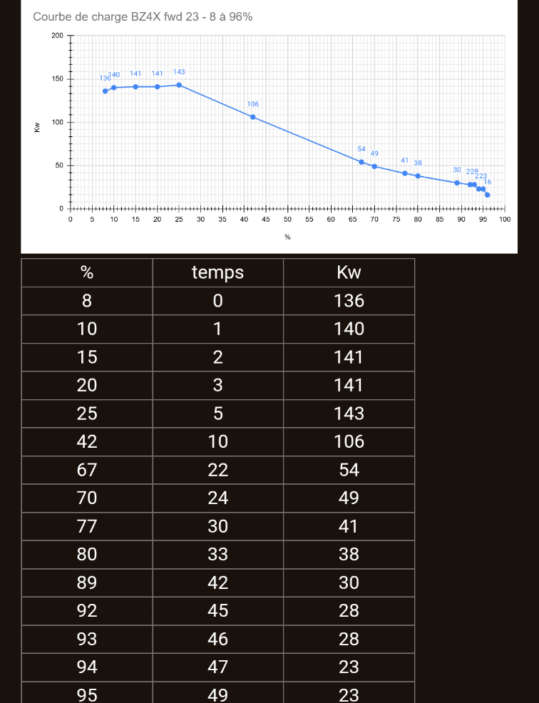 Salut. Pour les recharges, si vous souhaitez faire des arrêts rapides le top est de viser un 5/60% pour rester entre 15/20min. Le 10/80% prends régulièrement les 30min annoncées. Je n'ai pas encore eu le loisir d'essayer les recharges rapide par temps vraiment froids. J'ai prévu un séjour en Allemagne pour Noël et je vais pouvoir tester en condition hivernales... Ci-joint ma courbe de recharge pour vous donner une idée en conditions réelles. Cordialement