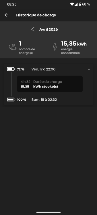 En fait, dans l'appli ce n'est pas très clair : voir ci dessous mon dernier relevé de charge En vérité, la charge à consommé 16,52 kWh (compteur d'énergie sur la prise) Et ce "15,35 kWh stocké(s)" ou "consommée " (?), d'après l'appli, ne correspond pas au 28 % (100-72) chargés pour une batterie de 52 kWh ni à la conso réelle relevée à mon compteur. Je soupçonne l'appli de considérer la capacité brute de la batterie (55 kWh) -> 55 kWh x 28% = 15.4 kWh, proche de "15,35 kWh".