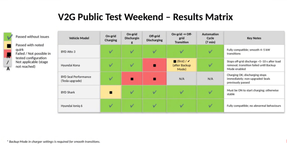 Dans la dernière vidéo, on voit un comparatif intéressant: Ça démontre que malgré la "compatibilité" vendue, l'expérience dépend beaucoup de l'implémentation. Après, je ne sais pas si tous les véhicules listés sont officiellement compatibles V2G. En tout cas, ça m'intéresserait de comprendre quel est le protocole utilisé, et s'il y a une différence fondamentale (du point de vue de la voiture) entre V2G et V2H. Je pense que pour la voiture c'est identique: il y a du courant fluctue dans un sens où dans l'autre, et un câble de communication pour la puissance disponible / nécessaire / délivrée. La voiture n'a pas besoin de savoir où va le courant. Je pense que c'est plutôt la borne qui équilibre les charges. Et du coup, j'imagine que c'est surtout le type de borne qui va déterminer s'il est possible de faire du V2H, du V2G, ou les deux. Dans l'absolu, je me demande si c'est pas techniquement possible de relier directement la voiture au tableau via son adaptateur V2L, puis de couper la maison du réseau avec un commutateur de transfert, et de fonctionner en mode ilôtage? Alors certes ça sera pas aussi flexible qu'un chargeur bidirectionnel: on pourrait envoyer du courant dans les deux sens, mais il faut une opération manuelle pour chaque changement de sens. Et c'est probablement illégal. Mais techniquement, c'est possible? -