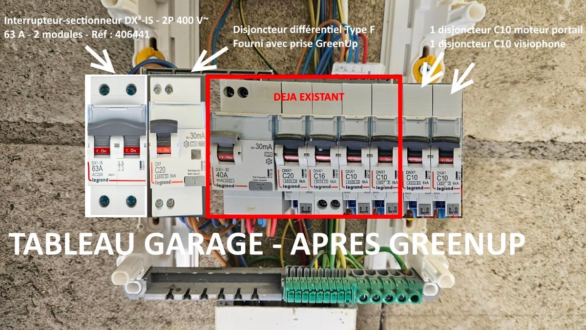Bonjour, je souhaite installer une prise GreenUp dans mon garage qui est à 10m de ma maison. J'ai mis une photo du tableau divisionnaire du garage sur lequel je veux installer la prise. Comme j'ai déjà un disjoncteur on m'a indiqué que je devais mettre un interrupteur sectionneur. Je souhaite aussi ajouter un portail et visiophone. Pourriez-vous me dire si mon schéma (montage photo) est bon ? Merci ! (j'ai déjà acheté le kit greenup)