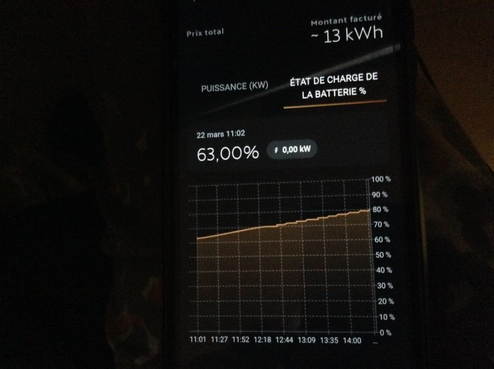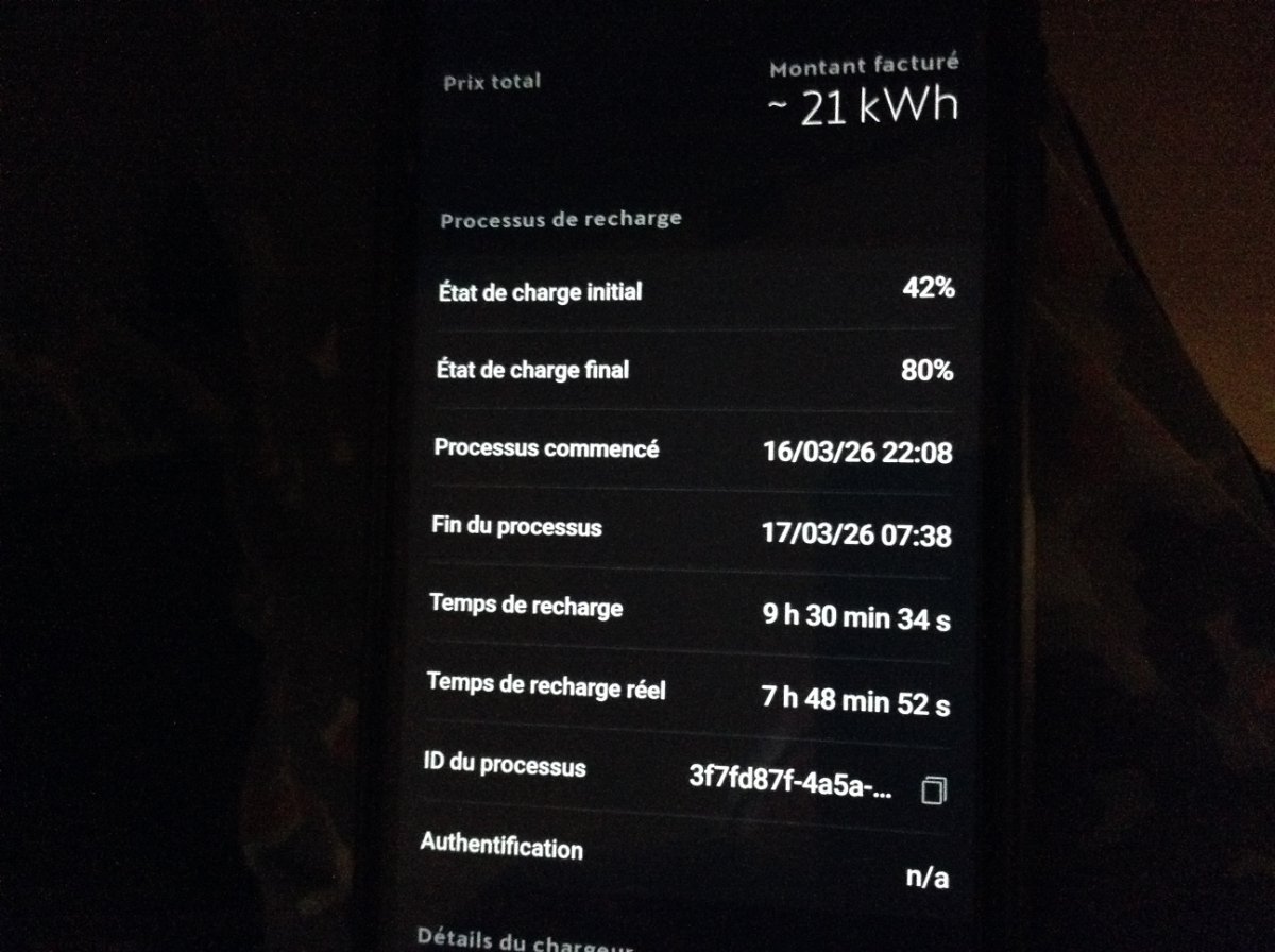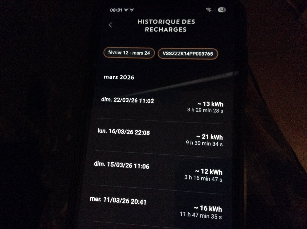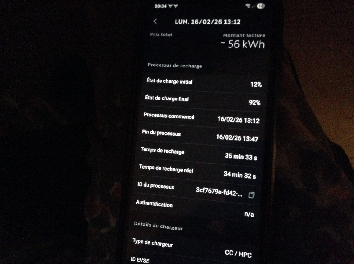 Hello tous, Je viens de remarquer que (je suppose) à la suite de la mise à jour de l'application en version 2.15.0 du 06 mars 2026, l'historique des recharges est consultable. L'historique affiche mes recharges depuis le 13/02 en précisant le pourcentage de début et de fin, la durée de charge et le nombre de kilowattheure reçu. Le "temps de recharge" indique apparemment le "temps de branchement" puisque pour cette charge à domicile la charge c'est terminée vers les 6 heures du matin et que je n'ai pas débranché l'auto directement. Ma plus grosse charge sur borne rapide (j'ai dépassé les 80% "recommandés" parce que j'étais seul à la station et que j'avais vue sur l'auto pour libérer la place si plusieurs personnes arrivaient. Apparemment seule la dernière recharge affiche également la courbe de recharge (à vérifier car lors de la composition de ce message, la recharge de cette nuit n'apparaissait pas encore c'était donc l'avant dernier charge qui affichait la courbe, mais la dernière charge vient de s'afficher avec la courbe, je dois donc attendre un peu pour voir si l'avant-dernière perd l'affichage de la courbe dans les prochaines heures). Charge à domicile, pas encore eu l'occasion de tester sur borne rapide pour voir la courbe
