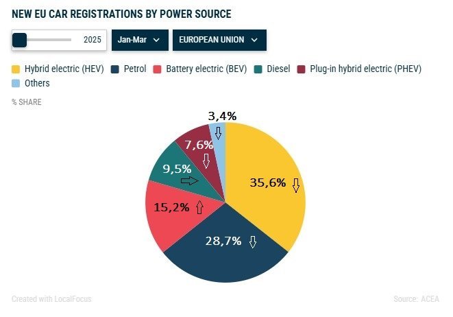 C'est bizarre, je n'ai pas le meme sens pour les fleches.... Hybrides : 35,6% -> 38,6%. La fleche ↗️ Essence : 28,7% -> 22,6%. La fleche ⬇️ EV : 15,2% -> 19,4%. La fleche ⬆️ pHEV : 7,6% -> 9,5%. La fleche ↗️ Diesel : 9,5% -> 7,7%. La fleche ↘️ Autres (E85, H2, GNV, GPL) : 3,4% -> 2,2%. La fleche ↘️ -