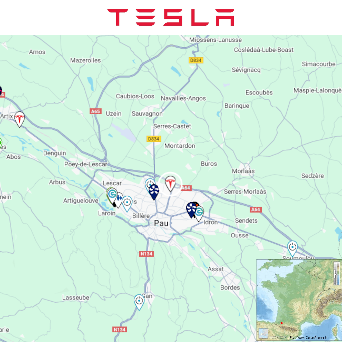 Remplacement des bornes d'une station Tesla à Pau (Kiriad). 8x 250kW CCS désormais Prix sans abonnement/non Tesla sur la capture Comme d'habitude, retrouvez le lien vers ma carte : https://tinyurl.com/StationsVE Toute l'actu des stations de recharge sur le groupe FB : https://tinyurl.com/GroupeFacebookVE -