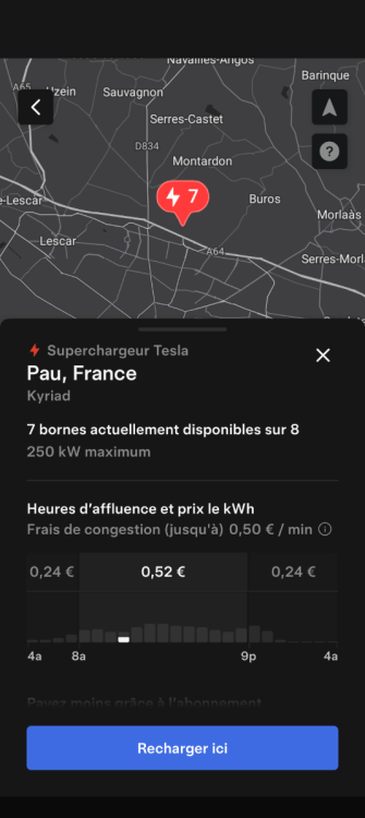 Remplacement des bornes d'une station Tesla à Pau (Kiriad). 8x 250kW CCS désormais Prix sans abonnement/non Tesla sur la capture Comme d'habitude, retrouvez le lien vers ma carte : https://tinyurl.com/StationsVE Toute l'actu des stations de recharge sur le groupe FB : https://tinyurl.com/GroupeFacebookVE