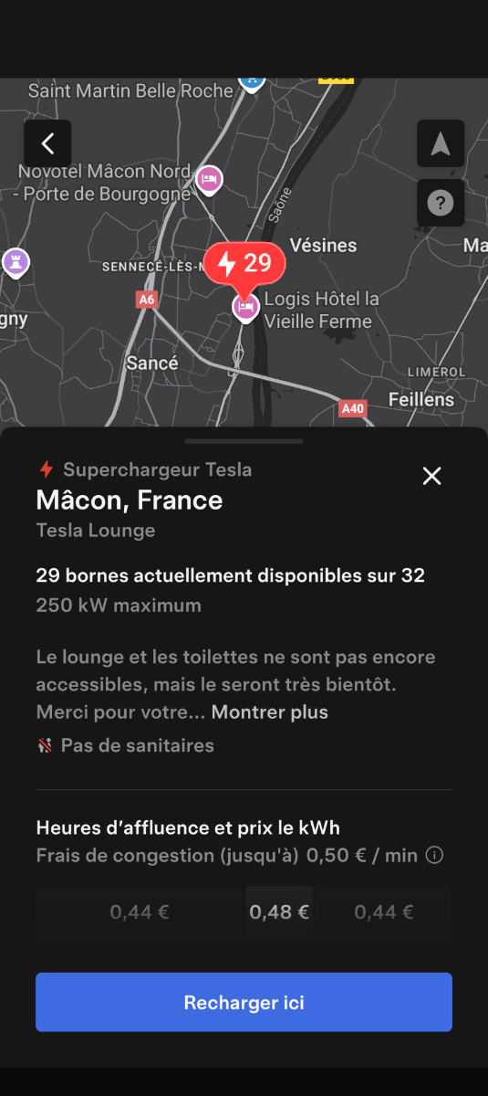 Remplacement des bornes d'une station Tesla à Sancé (Hôtel Restaurant La vieille Ferme). 32x 250kW CCS désormais Ajour d'un Lounge également Prix sans abonnement/non Tesla sur la capture Comme d'habitude, retrouvez le lien vers ma carte : https://tinyurl.com/StationsVE Toute l'actu des stations de recharge sur le groupe FB : https://tinyurl.com/GroupeFacebookVE -