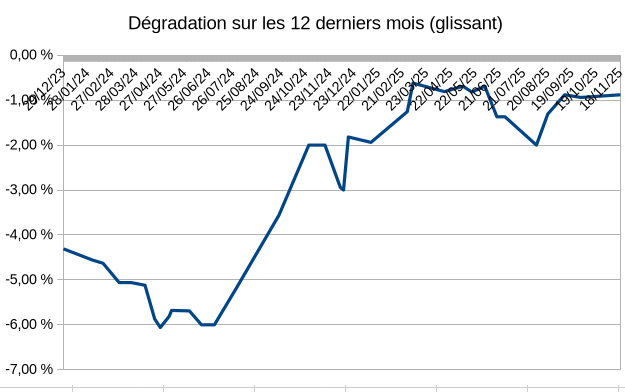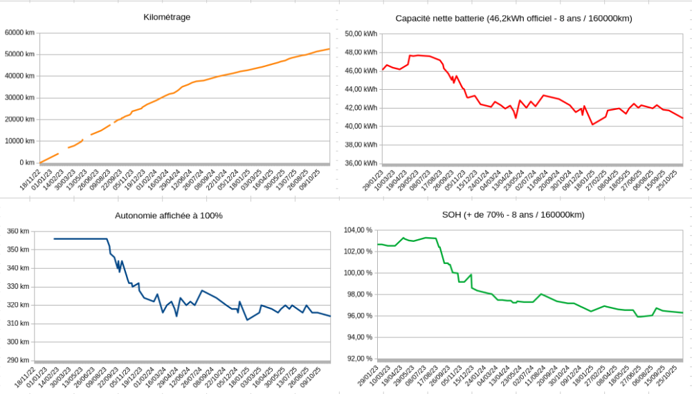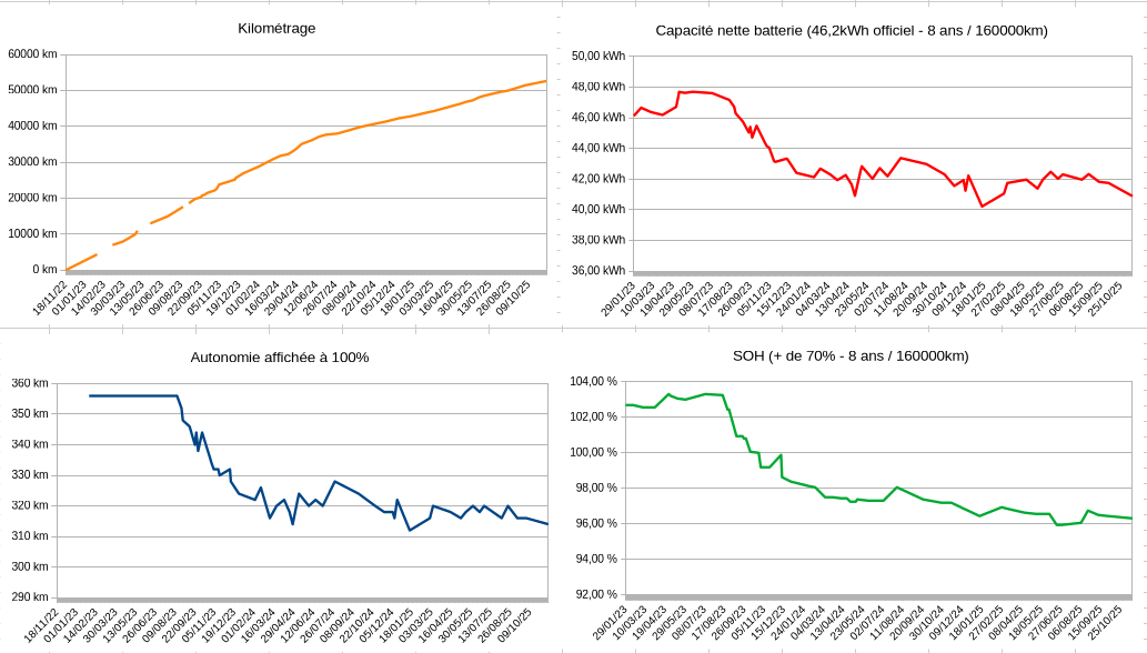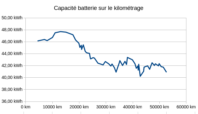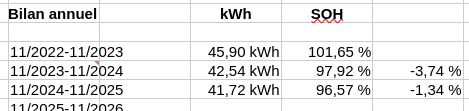 Cela fait 3 ans que j'ai réceptionné la voiture ! Donc bilan SOH des 3 ans ! Il devient évident que l'on voit bien l'influence de la température sur la capacité nette de la batterie (diagramme en haut à droite). On distingue une courbe qui rappelle un courant redressé qui se répète sur les 3 années de suivi. Le top en été au moins d'août, le plus bas vers février. Mon garage met du temps à se refroidir l'hiver mais aussi à se réchauffer l'été car il est semi-enterré. On retrouve ces bosses avec le kilométrage en abscisse. Note : la voiture roule moins depuis le second VE arrivé au milieu du suivi (06/2024). On dirait que la chute du SOH est énorme mais dans la pratique, entre la seconde et la troisième année, elle est faible. Et, plus simple, en années : Note : le première année reste une anomalie collée aux déclaration du constructeur aussi bien en terme de capacité que d'autonomie. Du coup, cette batterie vendue comme une 50kWh brut, 46.2 kWh nette, elle a une capacité théorique de combien ? Et bien la réponse c'est entre 42 kWh et 44 kWh selon la température moins la dégradation. Pour simplifier, la batterie de la 136ch / 50kW est a une capacité utile théorique à 100% de 43kWh +/- 1 kWh selon la température à la laquelle on applique la dégradation (SOH) ! -