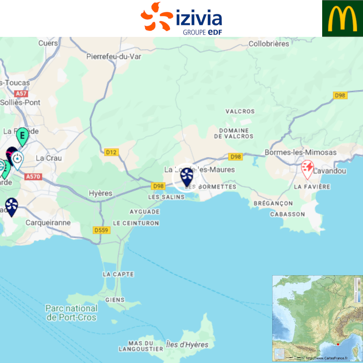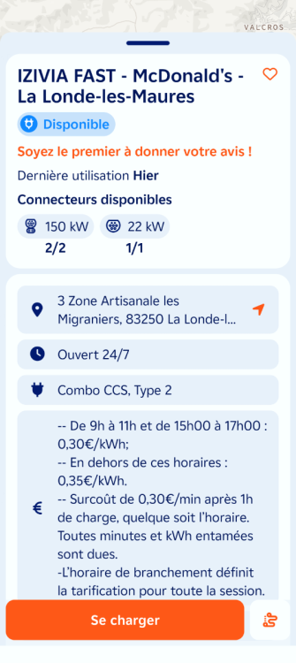 Ouverture d'une station Izivia à La Londe-les-Maures (McDonald's). 2x 150kW CCS Comme d'habitude, retrouvez le lien vers ma carte : https://tinyurl.com/StationsVE Toute l'actu des stations de recharge sur le groupe FB : https://tinyurl.com/GroupeFacebookVE -