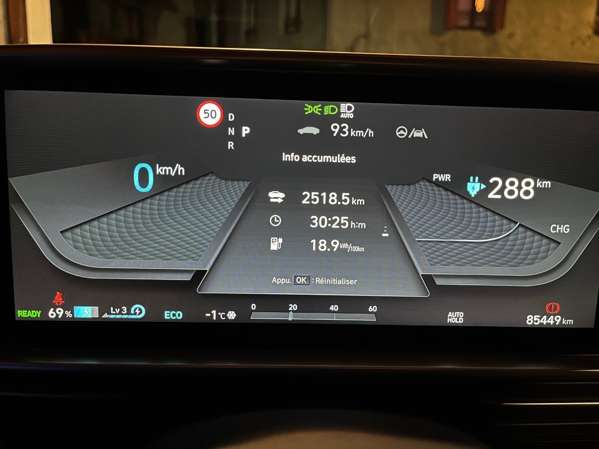 Petit retour des vacances. Départ du côté d’Ambert, dans le 63, pour Arnhem aux Pays-Bas. Voyage entre 2 et 4 dans la voiture + bagages. Neige sur les 100 premiers km, ensuite beau temps (mais froid). Au retour, très froid (jusqu’à −8 °C en Belgique). Départ d’Arnhem (PB), jusqu’à chez moi (63) via Metz et Dijon : Le calcul de la vitesse moyenne ici sera biaisée car le contact était mis lorsqu’elle était en charge. Aussi les 2 500 km ici sont sur toutes les vacances (5 jours). Pas seulement l’autoroute. Mais bon, 19 kWh/100 km en hiver, avec chauffage constant, pas mal de préchauffage, de la neige (et du mode neige sur 50 km derrière un chasse-neige) et 2 à 4 personnes selon la portion du trajet, c’est pas mal. Là où je suis content aussi, c’est que j’ai tenté de faire le trajet Arnhem - Metz d’une traite et j’ai réussi \o/. En plein hiver, températures entre −3 et −8 °C sur tout le trajet. La voiture n’y croyait pas au départ. Au final, il restait 4 % (départ fait à 100 %), on était large. Le tout avec mon AWD, pneus 18" et avec un peu de préchauffage de la batterie. Ceux qui disent qu’on ne peut pas rouler 2 heures sans charger sont des menteurs. Perso après 4h20, j’avais quand-même bien envie de pisser, donc j’aurais pas fait 50 km de plus si j’avais pu : Quelques remarques sur la voiture, qui tiennent aussi lieu de remarques à Hyundai (et d’un énième ralage) : – il faudrait que l’on puisse dire à la voiture qu’on s’en fiche si l’autonomie est insuffisante et que je gère moi-même. Je veux dire, définitivement. À chaque fois que je mets un waypoint dans la navigation, il me fait la remarque. Et oui, la case au dessus du choix des trajets est décoché. – Trois arrêts max dans la navigation ? Sérieux ? – Certains arrêts sont des chargeurs. Il devrait les détecter tout seul, plutôt que de devoir retirer l’arrêt, et ajouter un "station" ensuite (car si le chargeur est trop prêt d’un arrêt, il refuse de l’ajouter). – Si l’arrêt est trop loin, qu’il ne mette pas "inconnu", mais un pourcentage négatif (comme d’autres constructeurs). Sinon, RàS. Toujours magique, comme voiture. -