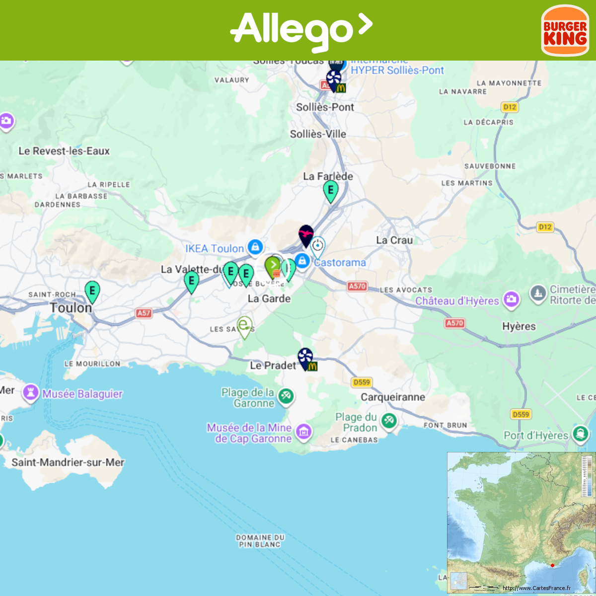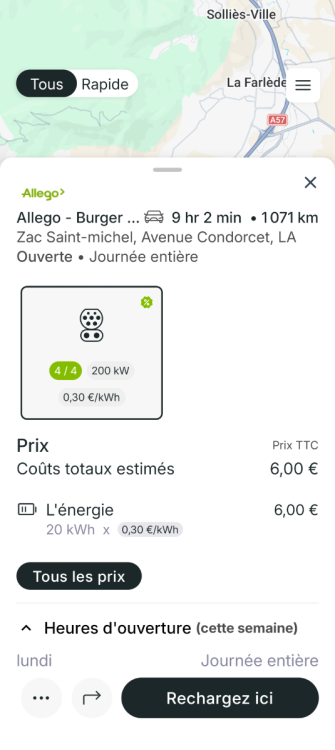 Ouverture d'une station Allego à La Garde (Burger King). 4x 200kW CCS Comme d'habitude, retrouvez le lien vers ma carte : https://tinyurl.com/StationsVE Toute l'actu des stations de recharge sur le groupe FB : https://tinyurl.com/GroupeFacebookVE -