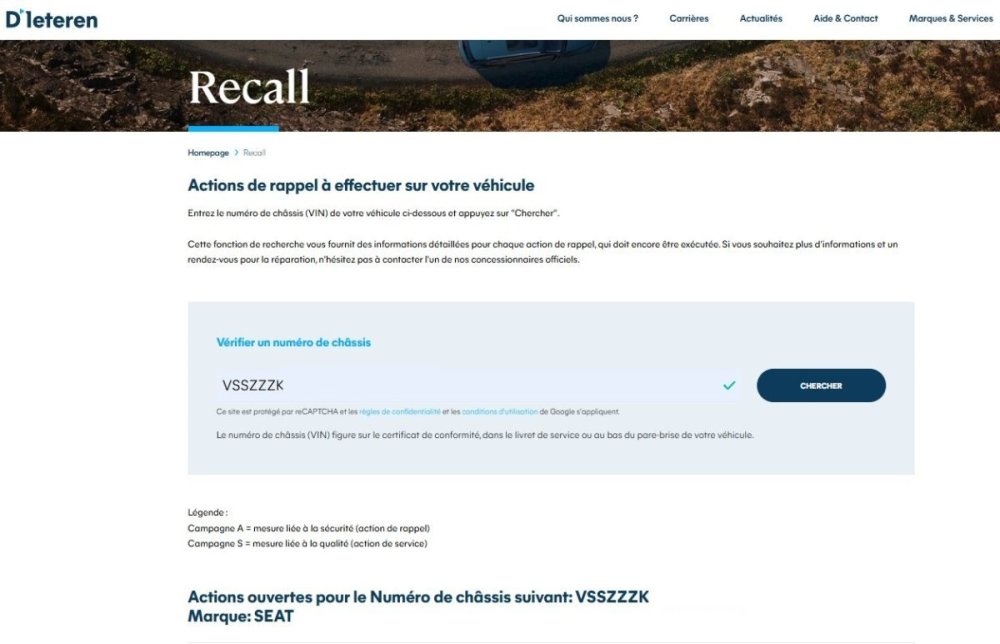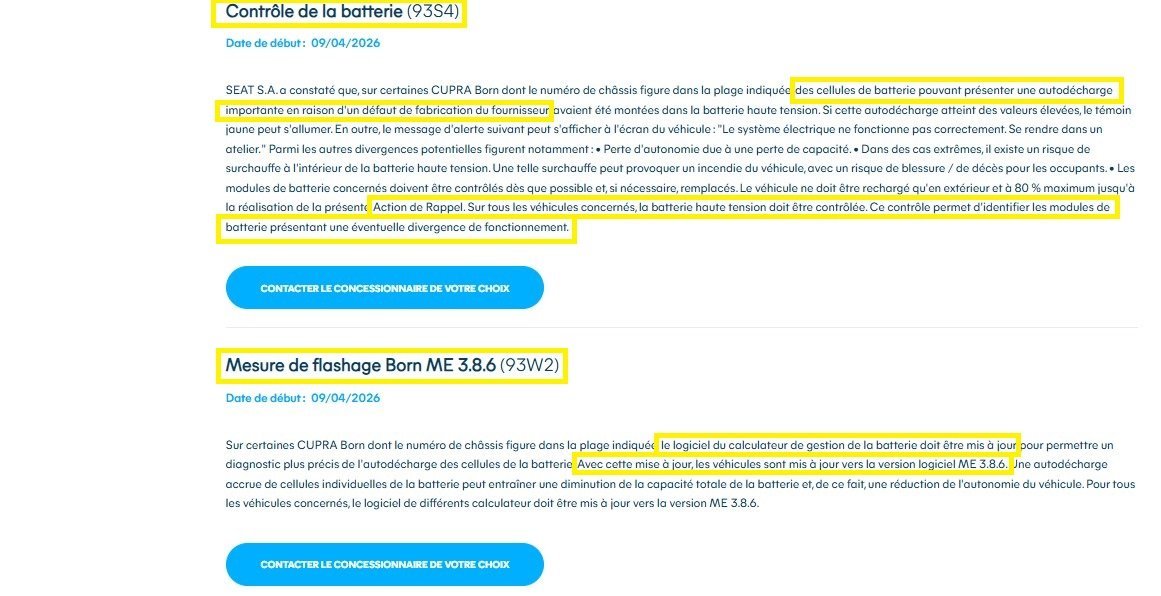 Bonjour, Bien que j'avais vérifié à plusieurs reprises si une action de rappel concernait ma Cupra (sans rien trouver sur le site Rappels CUPRA : vérifiez votre véhicule qui renvoie lui-même vers dieteren.be/fr/recall/) je reçois ce jour (mardi 28/04/26) un courrier uniquement en néerlandais, qui m'informe que finalement je suis peut-être concerné. Ci-joint la saisie d'écran qui apparait maintenant sur le second site. Le courrier demande de contacter le concessionnaire, l'intervention est prise sous garantie et dure à minima 2 heures (si le contrôle ne signale pas de soucis) mais peut aller jusqu'à plusieurs jours si un remplacement de module s'avère nécessaire.