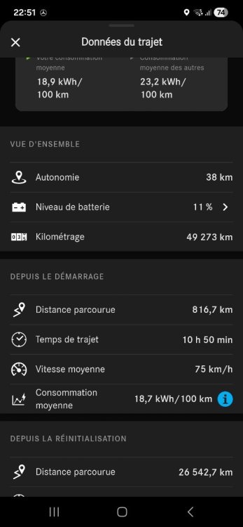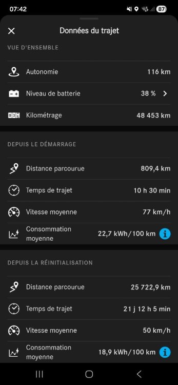 Je prends enfin le temps de retracer mes trajets de cet hiver (!) Trajet Lyon / Heerbrugg (Suisse) / Lyon fin novembre. Départ de Lyon à 100% puis passage au bureau (30km), départ du bureau à 17h à 91%. Météo : 5°C, pluie battante sans discontinuer. 156km, besoin de faire une pause. 31% à 58%, 16.10 kWh en 13 minutes soit 74 kW de moyenne (Electra de Gland) 110 km Arrivée à Fribourg avec 16%. 16% à 100%, 49.35 kWh en 1h09 soit 42.9 kW de moyenne (Electra IBIS Fribourg). Départ de Fribourg à 9h00, 2°C mais pas de pluie, 100%. 153km, besoin de faire une pause, et surtout nous sommes en avance pour récupérer un collègue à l'aéroport de Zurich. 52% à 72%, 11.75 kWh en 13 minutes soit 54 kW de moyenne (Fastned sur une aire vers Zurich). 126 km jusqu'à Heerbrug, puis trajets le soir pour aller à l'hôtel, le restau avec nos hôtes, ramener une personne chez lui et rentrer à l'hôtel. 15% à 100% à 11kW la nuit à l'hôtel. Lendemain matin, -2°C, neige. On quitte l'hôtel pour aller sur notre lieu de rendez vous où la voiture reste sur le parking extérieur, départ vers 15h sous la pluie, 2°C. Neige sur le trajet et embouteillages de sortie de bureaux de Zurich. 244km en déposant le collègue à l'aéroport de Zurich. La pluie s'arrête à partir d'ici. 17% à 74%, 33.85 kWh en 26minutes soit 81 kW de moyenne. On a galéré pendant 10 minutes facile à trouver la station Electra qui était en ait dans le sous sol du centre commercial, pas du tout indiqué en haut de la rampe... (Electra Berne Europaplatz). 177 km 8% à 61% en 20 minutes, soit 97kW de moyenne (Totalenergies, aire de Valleiry) 149 km, passage par le bureau pour déposer le collègue et retour à Lyon. Arrivée à Lyon à 3%. A noter que j'étais avec un collègue qui n'avait jamais voyagé en VE, et qui n'a pas été trop gêné par les pauses. J'ai du parfois rallonger mon trajet ou mal optimiser mes recharges car ma carte Totalenergies n'est pas acceptée partout en Suisse, contrairement à la France ou désormais je peux même aller chez Tesla. Des conditions un peu dantesques mais finalement j'ai enquillé les 1100 km sans problème. L'active Drive assist m'a vraiment aidé dans les embouteillages pour planifier mon trajet, et sur la fin, conduite de nuit sur autoroute peu chargée, avec la fatigue augmentant c'est rassurant. -