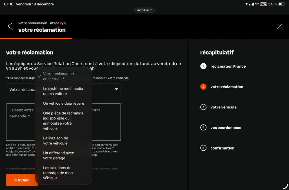 Merci Denis. Mais c’est ce que j’avais suivi sauf qu’au final ça ne concerne que les problèmes avec les voitures elles mêmes. J’avais pris la dernière option mais c’est qqun de Renault qui m’a contacté (rapidement) pour savoir quel était le souci avec ma Mégane (voiture que j’avais pris au pif avec une plaque d’un essai presse pour pouvoir m’inscrire). -