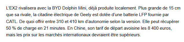 on espère bien 😂 il n'aurait aucune chance en France! marque inconnue, il est super moche... Sur un autre segment, les Leapmotor T03 se vendent pas non plus pour la même raison... (caractéristiques techniques dégueu en plus : 36 minutes pour le 30-80...) -
