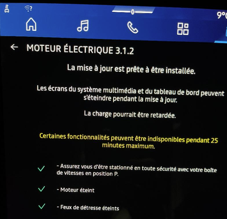 Bonjour à tous, Une campagne de test d'activation de One Pedal par FOTA vient de s'achever vendredi dernier. Les résultats sont conformes. Certains d'entre-vous (je ne connais pas sous quels critères, ni sous quel délai) vont recevoir cette mise à jour à priori sous le nom MOTEUR ELECTRIQUE 3.1.2. Si votre adresse mail est connue, vous allez aussi recevoir un mail de confirmation. Un fois téléchargée, il faut au maximum 25mn pour l'appliquer. Pour l'activer, palette droite au delà de la régénération max, pour la désactiver palette gauche Olivier