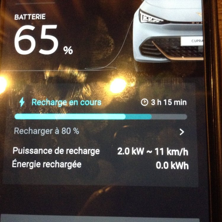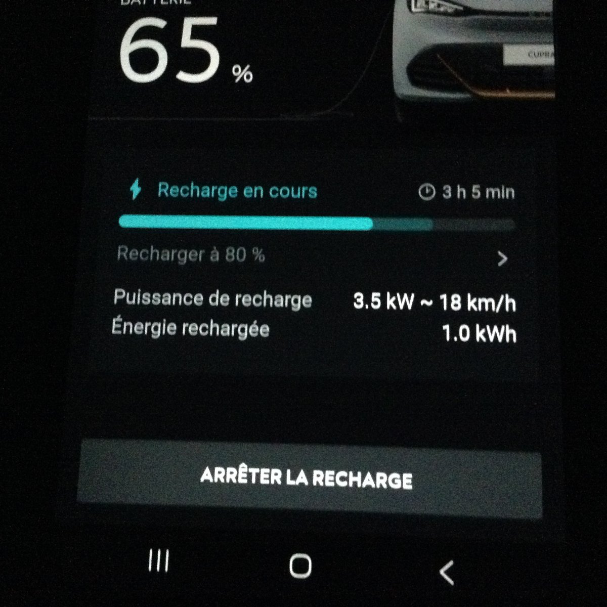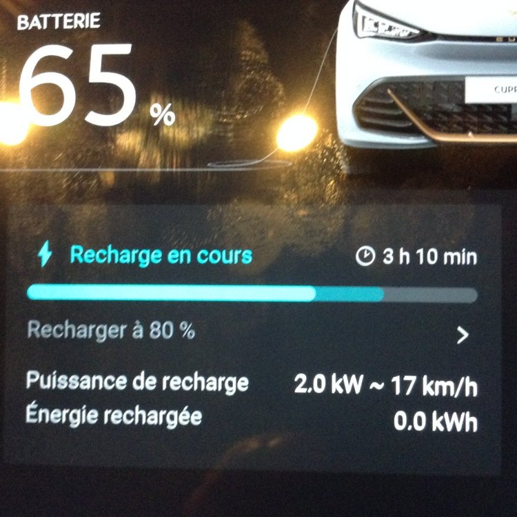 Salut, Attention à l'impact de la température qui n'est pas négligeable non plus, même si ça ne dure pas longtemps. j'ai remis l'auto en charge à la maison sur mon CRO 16A (voiture et batterie froide car stationné depuis trois heures trente par -5°) le début de charge était plutôt limité. Si je suis vite repassé à 3,5 kW de puissance, je n'ai pus monter qu'à 18km d'autonomie récupérée par heure de charge (en été je peux monter à 22). Détail intéressant, l'estimation de la durée de charge ne semble pas tenir compte des valeurs en tout début de charge. A part ça, Joyeux Noël à ceux qui passent par ici.