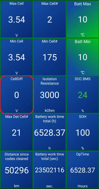 Rien de bien sorcier, cela est juste une information donnée par Carscanner quand tu es dans la partie "Tableau de Bord". Sur une des pages, tu devrais avoir quelque chose de ressemblant : Ici, tu peux voir le SOC, le SOH, le kilométrage, température Min & Max de la batterie et enfin la tension Min & Max des cellules avec la case encadrée en rouge qui correspond à cette Tension Différentielle (une simple soustraction Max-Min 😅). Il n'est pas anormal d'avoir 10/20mV en tension différentielle car même si le BMS est très performant, la chimie des cellules + le temps d'équilibrage fait que tu peux avoir cette différence. Par contre, avoir plus de 50 voir 100mV et/ou plus de tension différentielle et là clairement tu as un problème sur une/des cellules. Mais cela reste beaucoup moins probable que la température un peu trop haute côté voiture mais aussi côté borne -