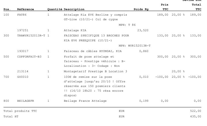 Je l'ai faire chez France attelage pour un attelage "Col de cygne" pour 520 euros montage compris. J'ai demandé de monter un faisceau spécifique pour EV6 précablé pour le branché directement sur la fiche derrière un panneau dans le coffre. Lorsque je branche une remorque, la voiture la détecte et recalcule automatiquement l'autonomie. Elle m'indique même lorsque d'un feu ne fonctionne pas sur la remorque. Quand j'ai interrogé le poseur, il m'a dit qu'il n'a pas reprogrammé la voiture juste posée le boitier contenu dans le kit du faisceau.