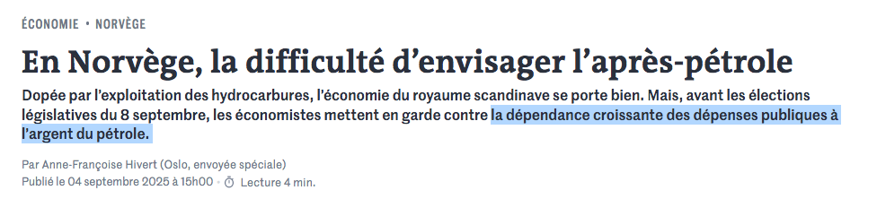 Passer de 30 à 99% dans les ventes de véhicules neufs. Parce que pour passer le parc à 99%, il va falloir purger tous les VT encore en circulation. Il faudra plus de 20 ans ? Le pays pris en exemple pour cette transition est la Norvège. Ils deviennent "moins dépendants du pétrole pour leurs véhicules", mais c'est quand même grâce au pétrole et aux larges revenus que ça procure au pays qu'ils peuvent financer le remplacement rapide des VT par des VE... Dernier point, la Norvège n'agit pas "rationnellement" pour la transition : elle vend du pétrole. C'est un peu comme si on prenait en exemple de lutte contre la drogue, un dealer qui arrêterait sa consommation personnelle mais qui continuerait à vendre sa came.