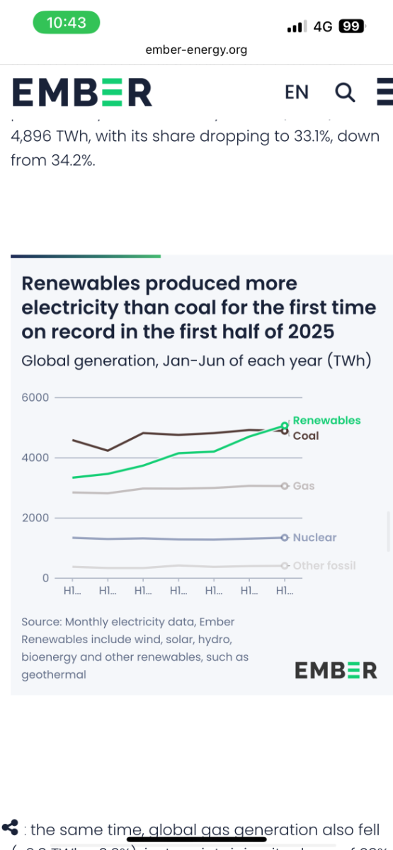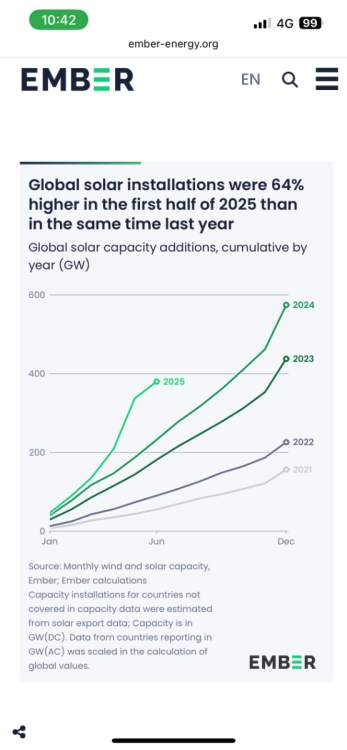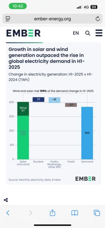 Les politiques en France sont stériles avec la complicité notre président bien aimé. La machine adminitrativre continue de produire toujours plus d’absurdité et de complexité contre productive. Le citoyen est perdu dans un capharnaüm incompréhensible. Pendant ce temps la terre continue de tourner. Que pouvons nous observé à l’issue de ce premier semestre. Un point d’inflexion a été atteint. la baisse de la consommation mondiale des fossiles pour la production de l’électricité au moins en % est un fait patent autrement dit indiscutable. voir les chiffres et courbes ci dessous. ce n’est pas pour autant un long fleuve tranquille qui nous attend. Mais il est difficile de luter contre la réalité surtout quand produire avec du solaire est tellement moins cher et plus facile, même si en lui même il ne peut en aucun cas être à lui seul une réponse à tout. Mais à lui seul il peut et va faire très mal aux énergies fossiles qui entame forcément leur plateau puis déclin. ” Au premier semestre 2025, la production solaire a bondi de 31 % en glissement annuel, portant sa part du mix électrique mondial de 6,9 % à 8,8 %. Grâce à une croissance record dans de nombreux pays, le solaire et l'éolien ont, ensemble, répondu à la nouvelle demande d'électricité, voire dépassé cette croissance, signalant que la demande mondiale en combustibles fossiles du secteur électrique approche de son pic. Il s'agit d'un moment crucial pour se montrer ambitieux et accélérer la transition. La baisse des prix du solaire et de l'éolien offre aux gouvernements une opportunité croissante de fixer des objectifs et des politiques plus ambitieux pour accélérer le déploiement. Cela permettrait de maximiser les avantages économiques, sociaux, sanitaires et environnementaux de l'énergie propre, tout en réduisant les émissions de carbone et en maintenant les objectifs de lutte contre le changement climatique à portée de main. La moitié de la planète a dépassé son pic de production d'énergie fossile, et les outils pour accélérer la transition sont disponibles. Cependant, certaines économies émergentes restent confrontées à des coûts de capital plus élevés et à d'autres contraintes de capacité. Le soutien des économies matures, en particulier celles qui ont un historique d'émissions, est crucial pour surmonter ces obstacles et maintenir la trajectoire vers la neutralité carbone.” https://ember-energy.org/latest-insights/global-electricity-mid-year-insights-2025/ -