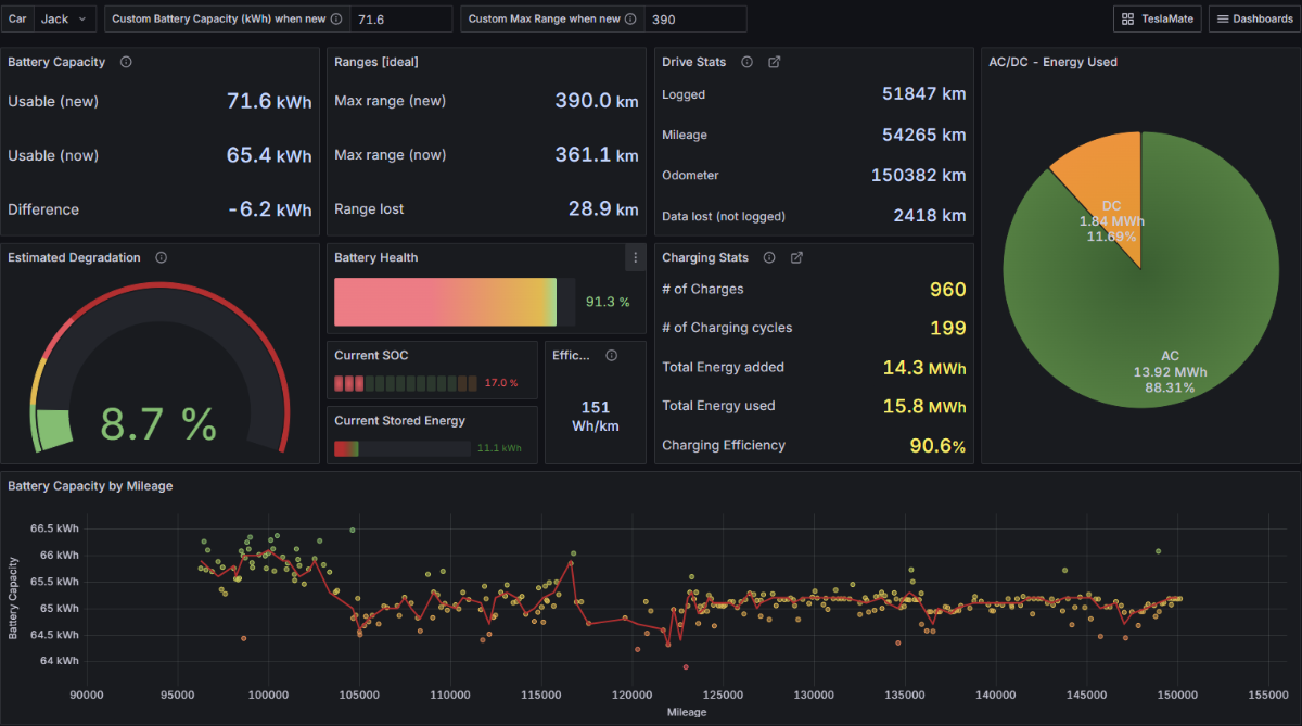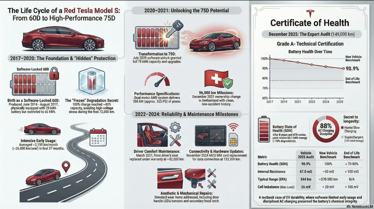 Je viens de remarqué une erreur que je fais depuis le début. La capacité utile de la BTX5 n'est pas de 72.6kWh mais 71.6kWh, ce qui change tout à la dégradation. Pour continuer avec l'IA, j'ai mis toutes les factures, tout l'entretien, toutes les docs officiels de la model S 2017, tous les rapports, les infos de TeslaMate, etc. dans NotebookLM et là vous avez un agent IA qui peut répondre à toutes les questions sur votre voiture. Vous pouvez lui demander de faire un dossier technique ou un bulletin de santé, une infographie historique, ... Dégradation qui change avec les 71.6kWh: et un exemple de ce que sort automartiquement NotebookLM: