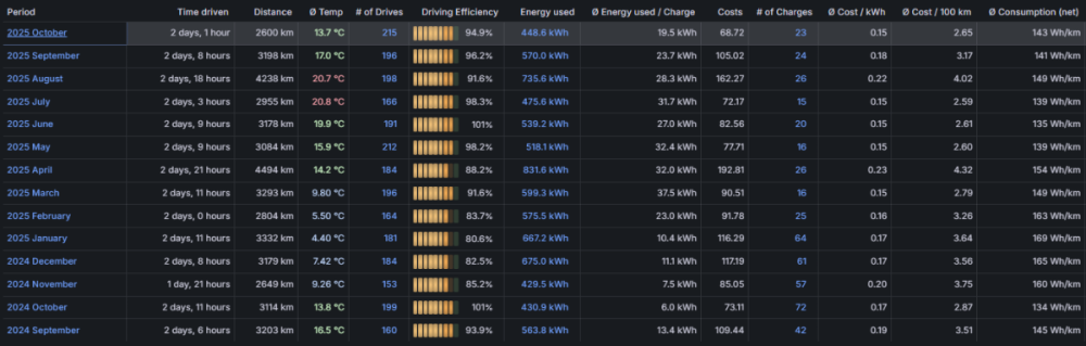 J'ai quand même l'impression que tu consommes plus après Mai. Si on regarde la colonne conso net et on compare les mêmes mois entre 2024 et 2025, tu consommes entre +20 et +30 Wh/km, c'est énorme. Soit ce sont les pneus, soit des changements de trajet, ou de façon de conduire. Et si on regarde juillet/aout/septembre, tu consommes autant qu'en hiver alors que ce sont les mois où généralement on consomme le moins (sauf si on fait + d'autoroute comme des trajets vancances) Je n'ai pas encore changer de pneus, j'ai les Hancook d'origine :
