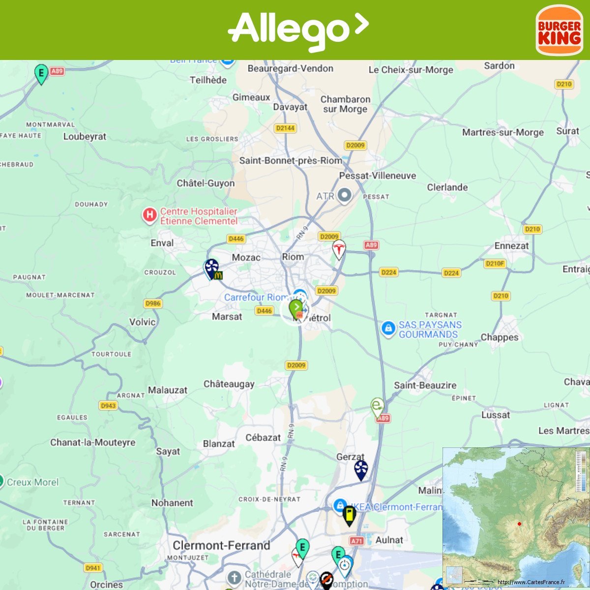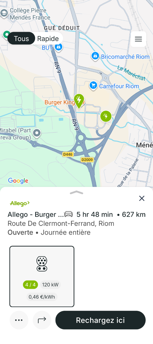 Ouverture d'une station Allego à Riom (Burger King). 4x 120kW CCS Comme d'habitude, retrouvez le lien vers ma carte : https://tinyurl.com/StationsVE Toute l'actu des stations de recharge sur le groupe FB : https://tinyurl.com/GroupeFacebookVE -
